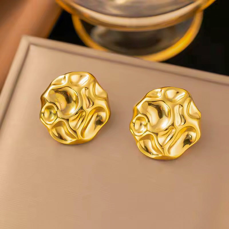 Make an effortless statement with our 18K Gold PVD Irregular Stud Earrings - where modern artistry meets timeless elegance. Each earring features a unique, molten-inspired texture that catches the light beautifully, adding a refined yet organic touch to your look.