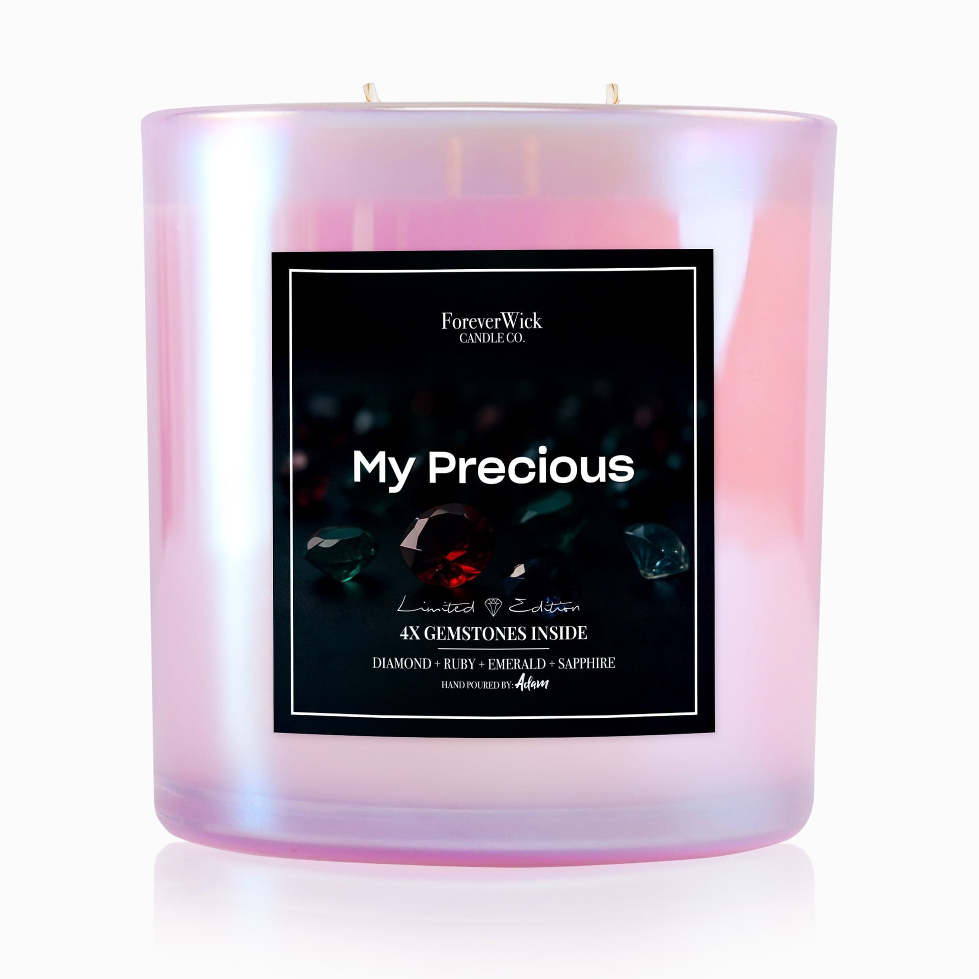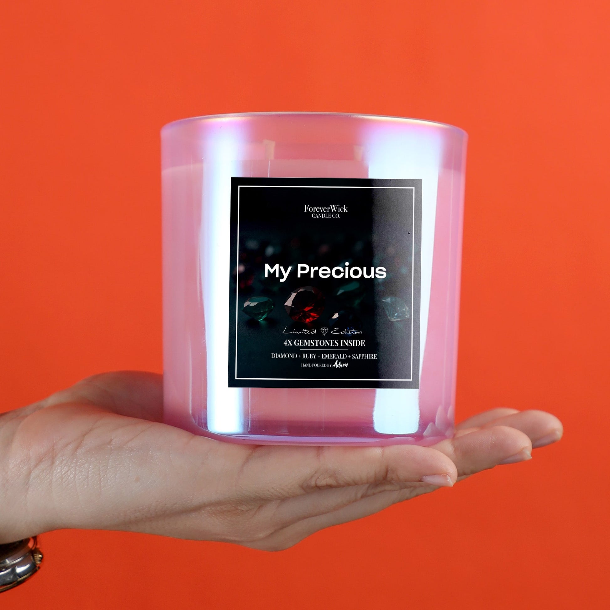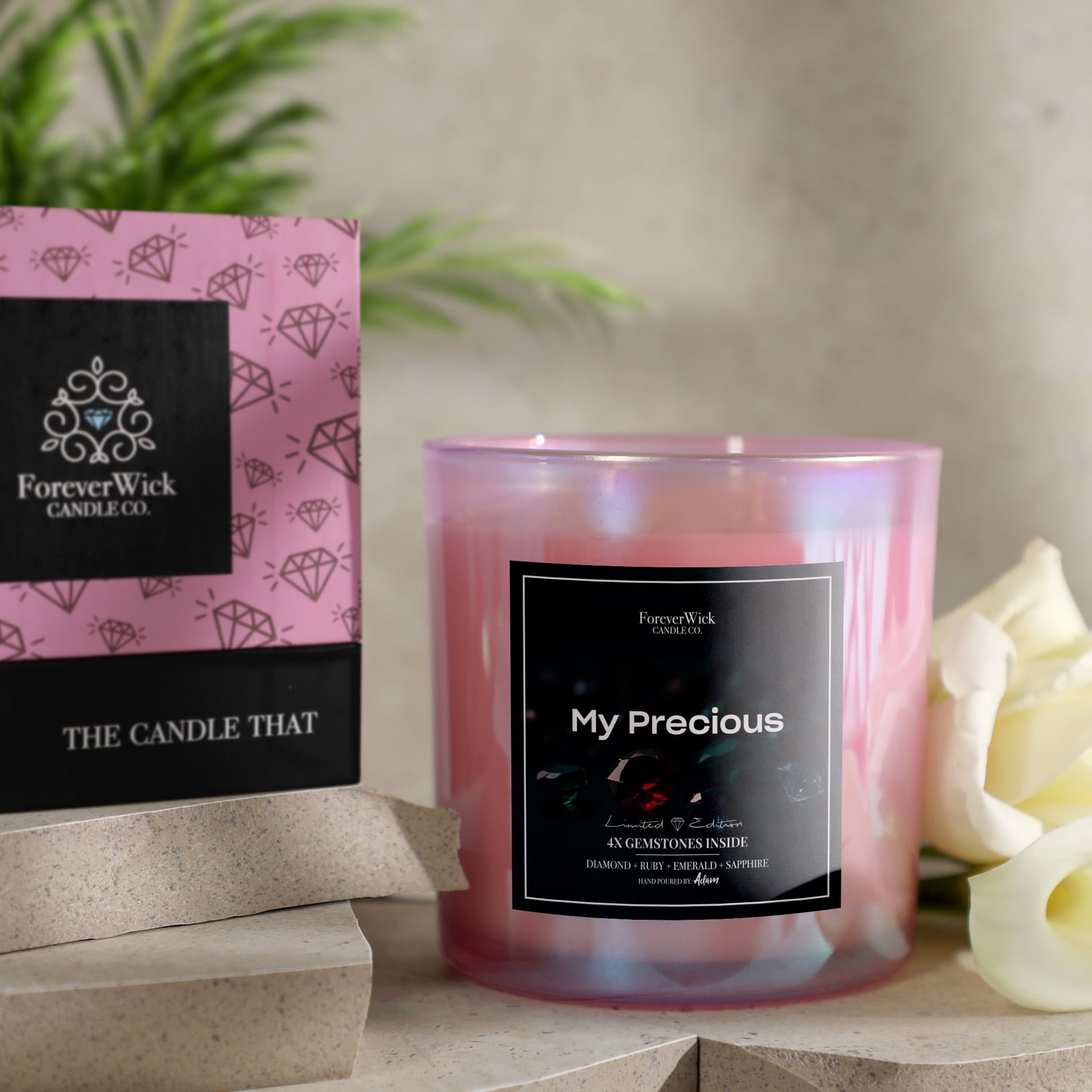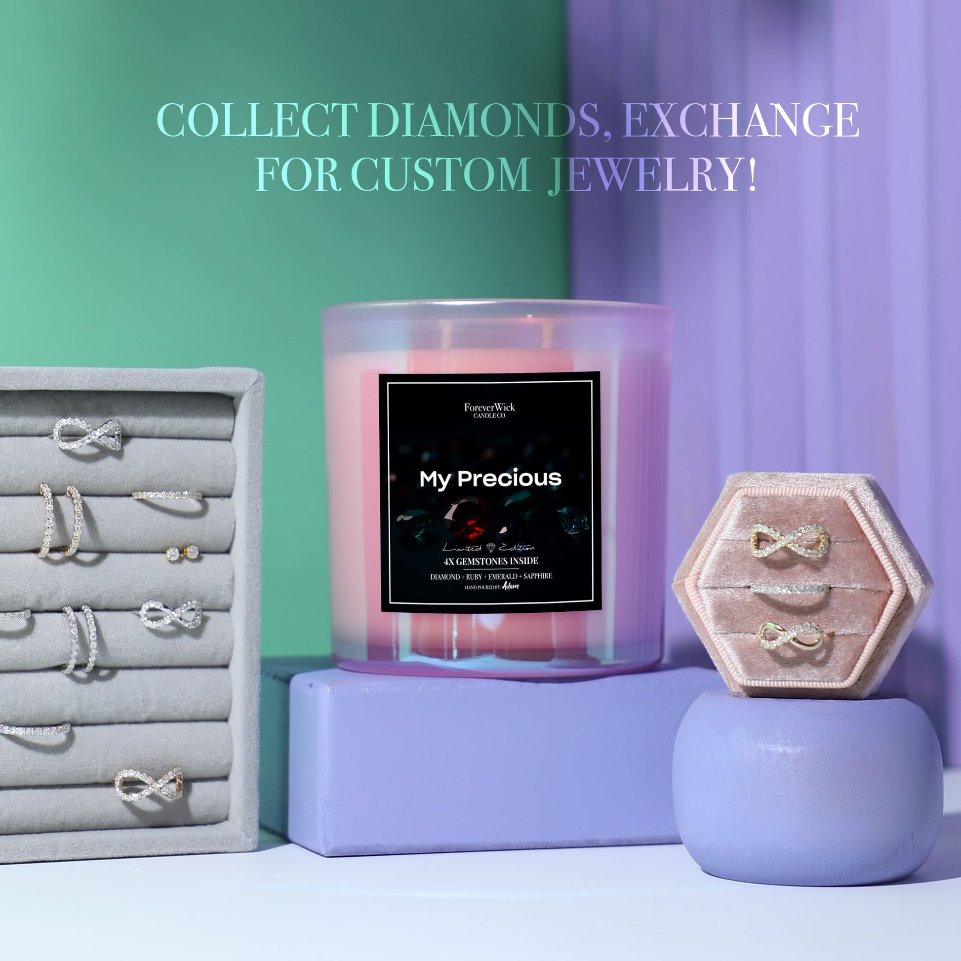 Inside this limited-edition ForeverWick Candle, you’ll discover a real diamond, ruby, emerald, and sapphire, each hidden beneath layers of creamy soy wax.