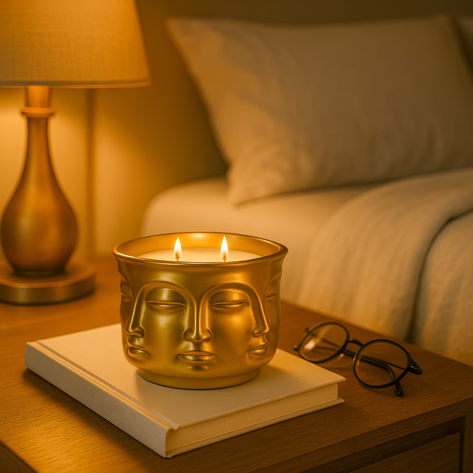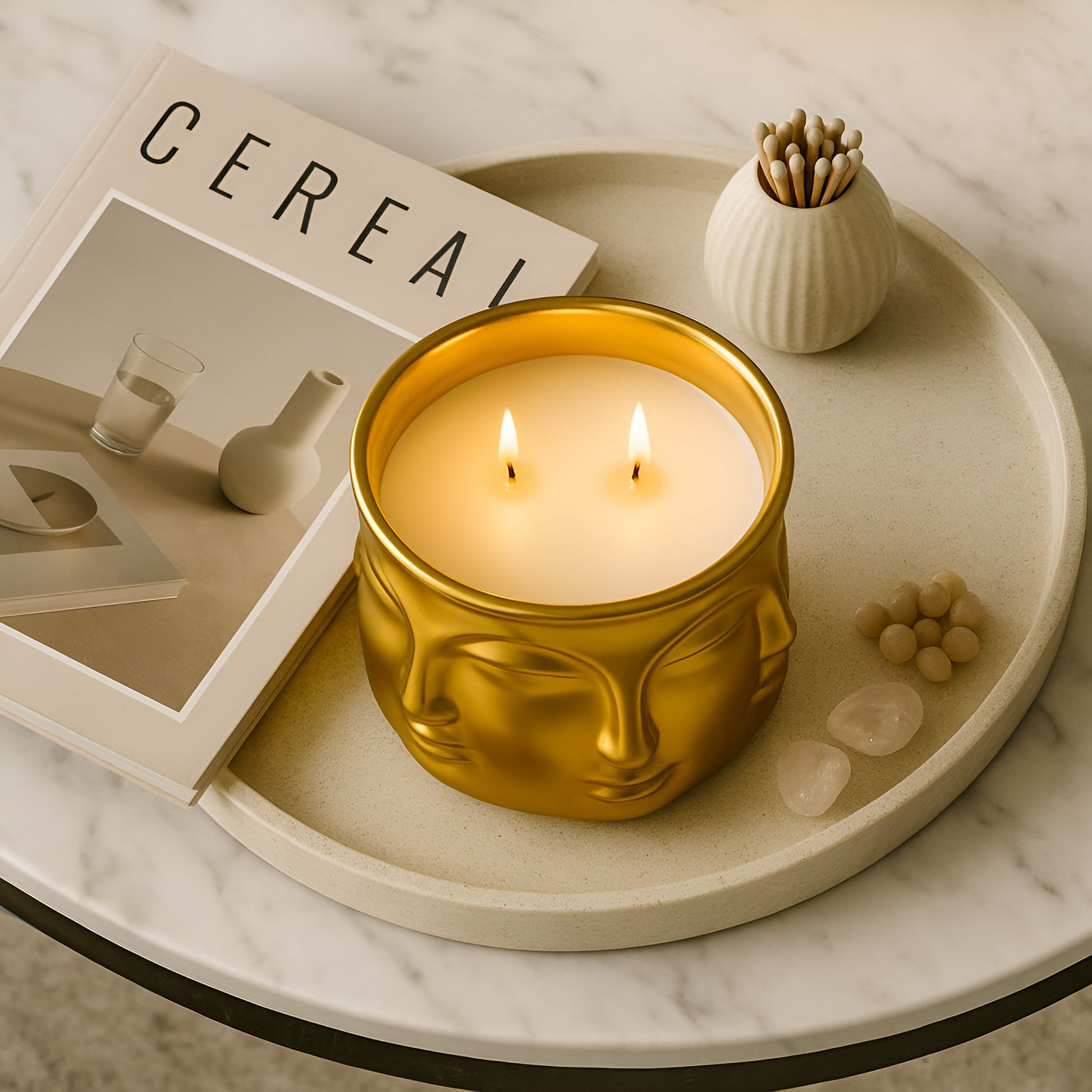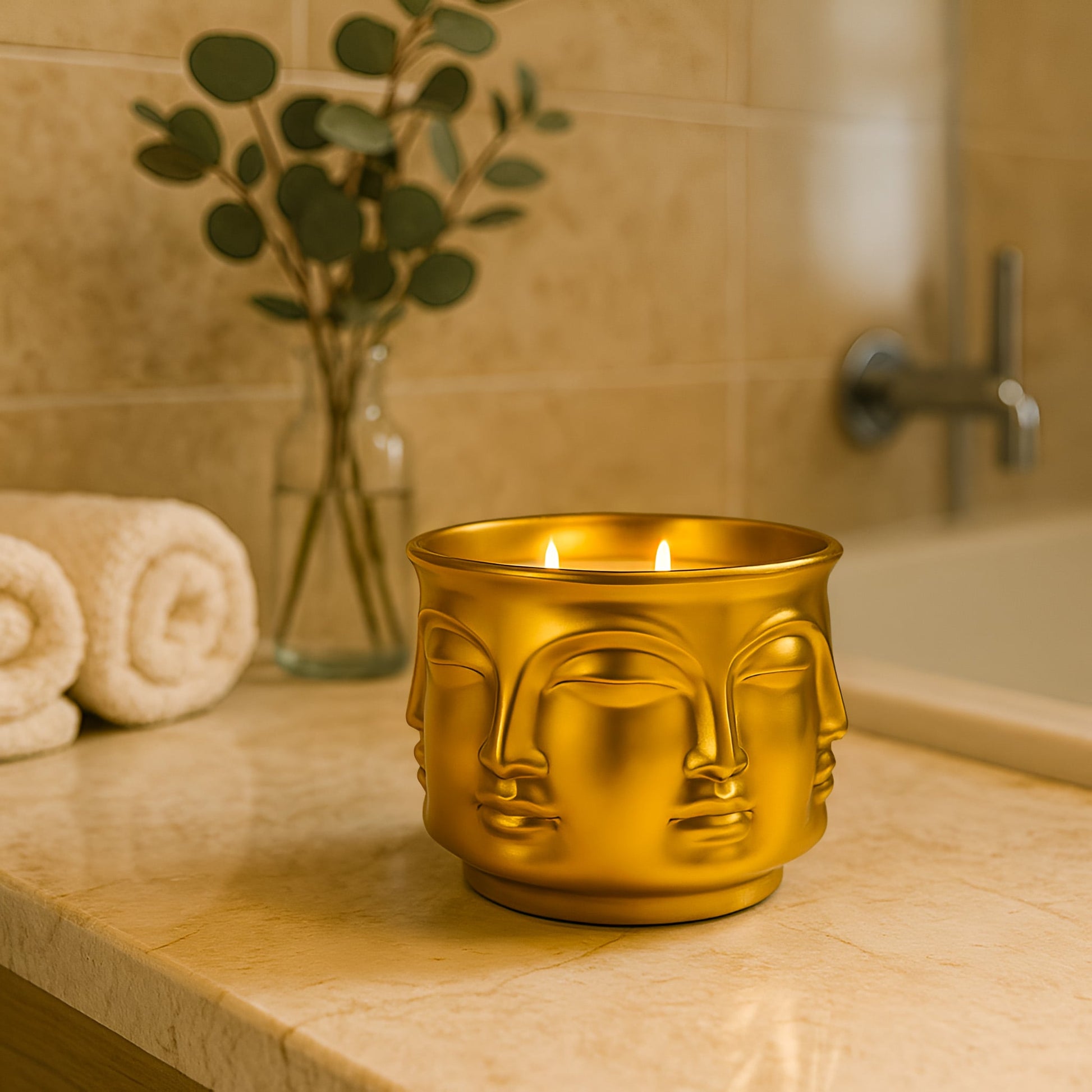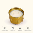 Elevate your surroundings with the Golden Enlightenment candle. Crafted with a Buddha head motif and dual wicks, this candle exudes a sense of calm and balance. Available in a luxurious gold vessel, it adds a touch of elegance to any space while filling it with the gentle fragrance of tranquility.