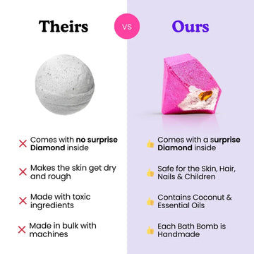 But that's not all – hidden within each bath bomb is a dazzling diamond surprise, ready to be unveiled as the bath bomb fizzes and dances in the water. Feel the excitement build as you discover the glistening treasure, making every bath a magical experience.