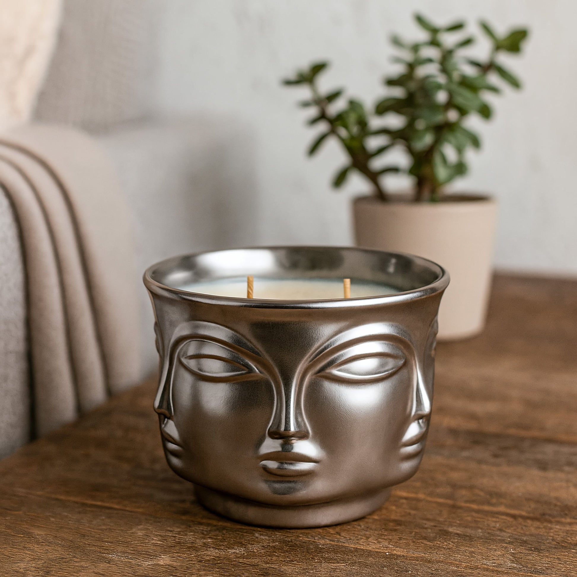 Illuminate your space with Silver Serenity, a captivating Buddha Head Candle designed to bring peace and tranquility into your home. With its dual wicks and silver vessel, this candle not only adds an elegant touch to your decor but also releases a calming aroma, creating a serene atmosphere for moments of mindfulness and relaxation.